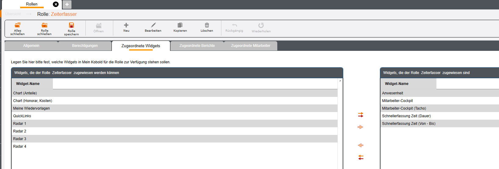 Wichtig prüfen Sie vorab welche Widgets Ihrem Mitarbeitern zur Verfügung stehen unter → Administration → Rollen → Zugeordnete Widgets