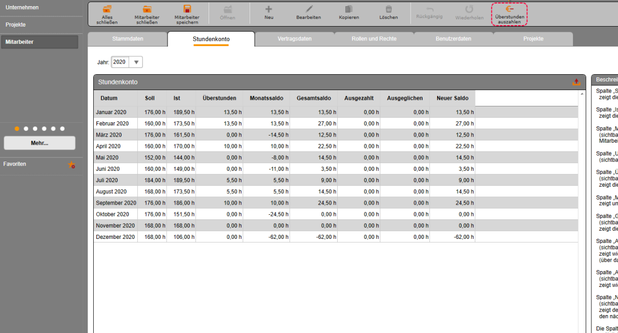 Stammdaten → Mitarbeiter → Stundenkonto(Diese Ansicht entspricht der Übersicht unter Zeiten → Stundenkonto.)